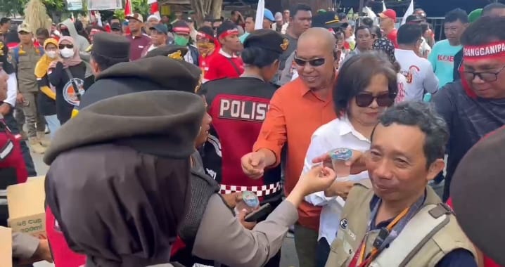 Dengan semangat Polri Presisi Polwanq Polda Sulteng melakukan aksi humanis membagikan gelas air mineral kepada massa yang bertahan didepan KPU.