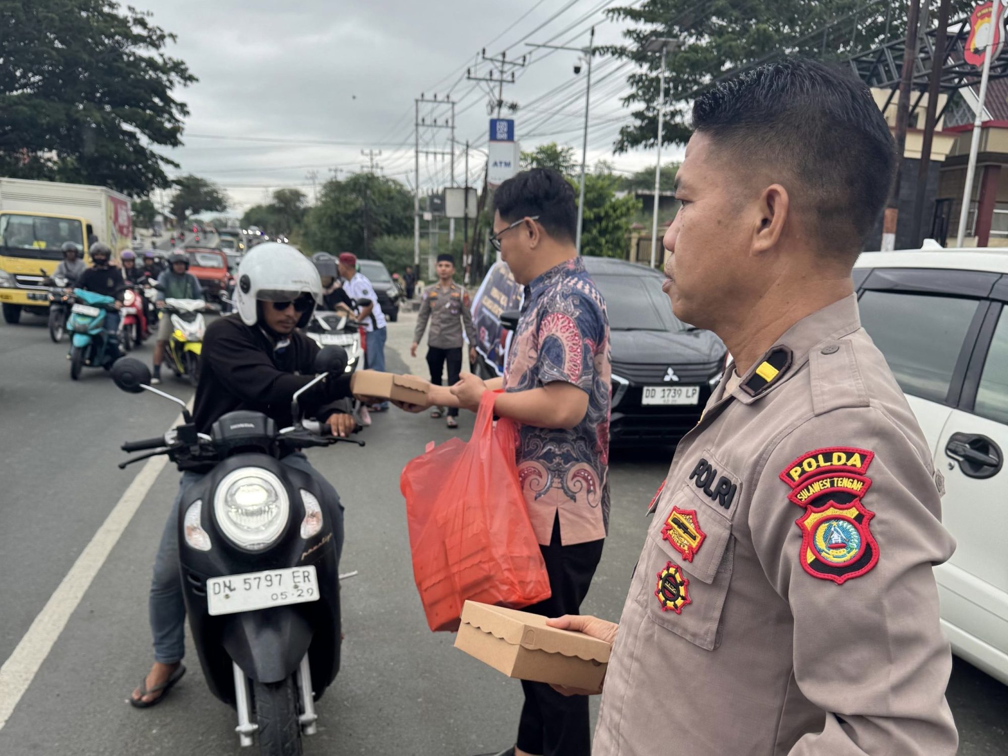 Pembagian takjil ini dilakukan menjelang waktu berbuka puasa dan ditujukan kepada pengendara yang melintas di sekitar Mako Polda Sulteng, serta masyarakat umum yang berada di kawasan tersebut.