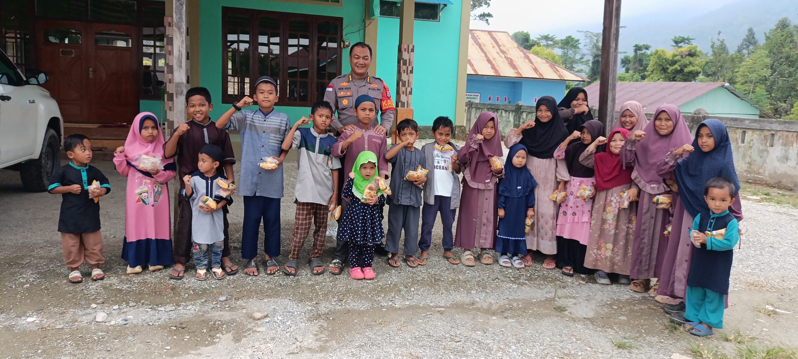 Dalam suasana penuh keakraban, Kaops Madago Raya Kombes Heni Agus Sunandar membagikan snack kepada puluhan anak yang akan mengikuti kegiatan mengaji.