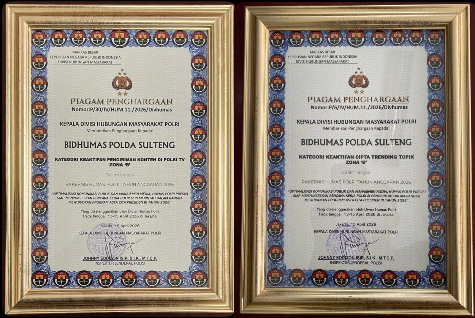 PALU NESIA — Bidang Polda (Bidhumas Polda Sulteng) meraih dua penghargaan pada Rapat Kerja Teknis () Humas Tahun Anggaran 2026 yang digelar di Jakarta.